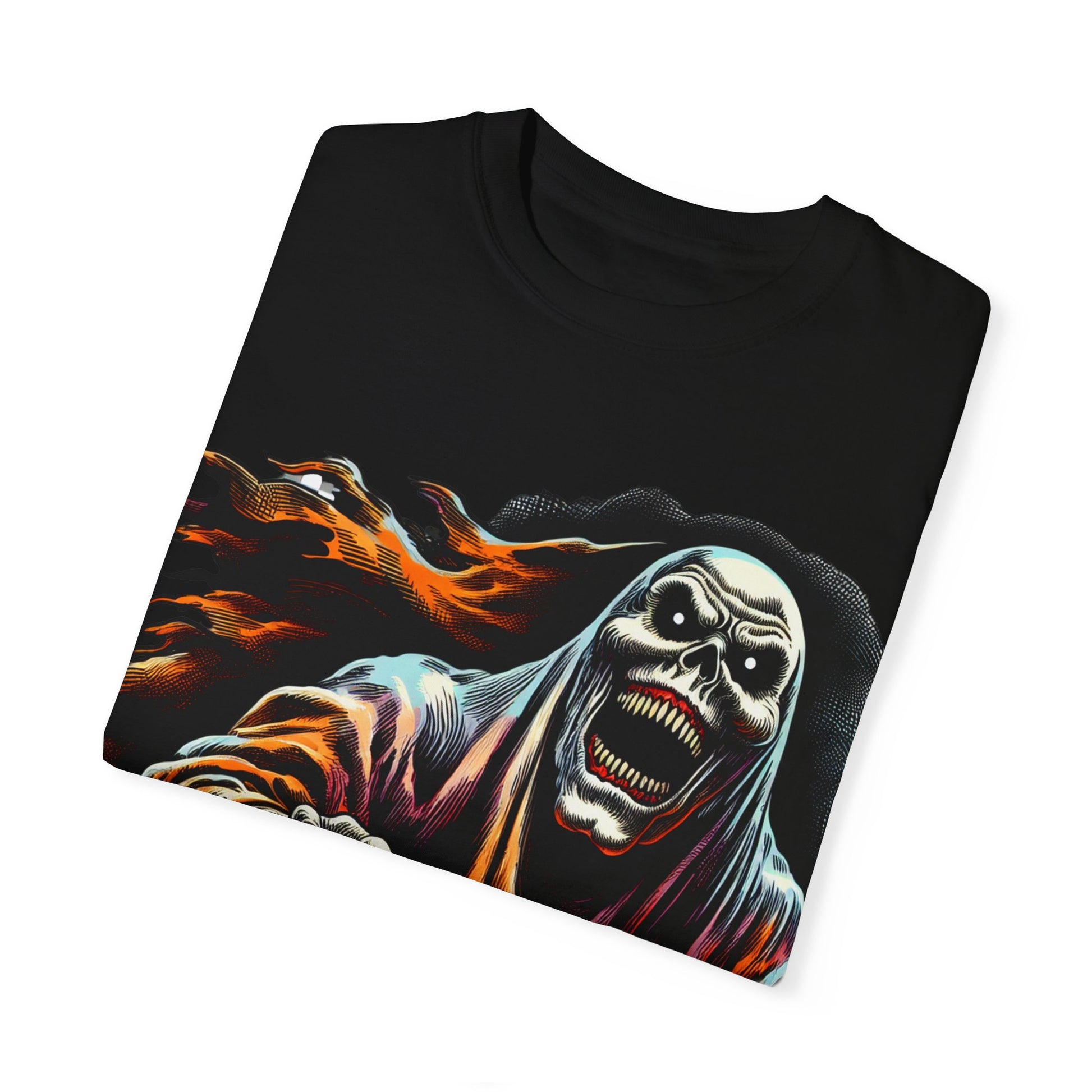 Ghosted design on a comfortable and versatile unisex garment-dyed T-shirt. Perfect for those who enjoy a subtle and mysterious vibe in their wardrobe. Ideal for casual wear or dressing up for special occasions. Relevant for Halloween, Day of the Dead, or other spooky celebrations.