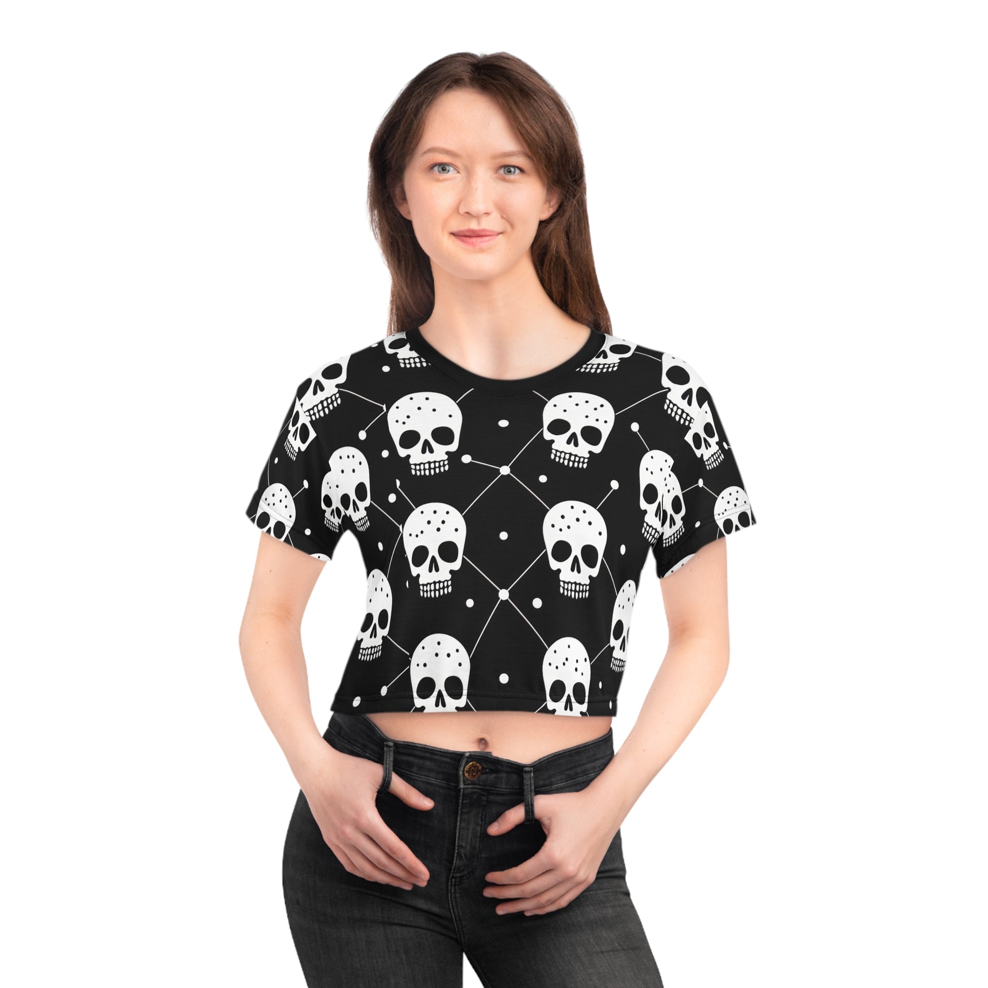 This Skull Crop Tee features a vibrant and detailed skull design, giving off an edgy and alternative vibe. Perfect for those who love unique and bold fashion statements, this tee is great for casual outings or music festivals. Ideal for Halloween, rock concerts, and everyday wear.